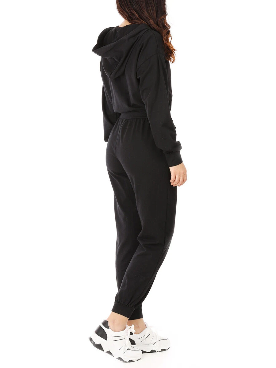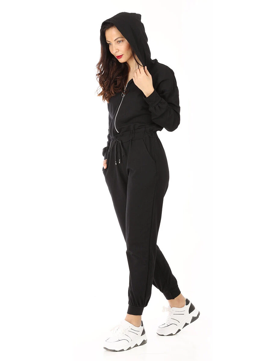 Combinaison pantalon style « sweat » avec capuche et fermeture zippée.