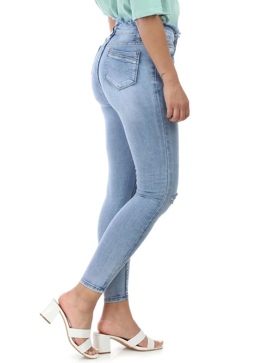 Jeans skinny légèrement délavé troué sur le devant.