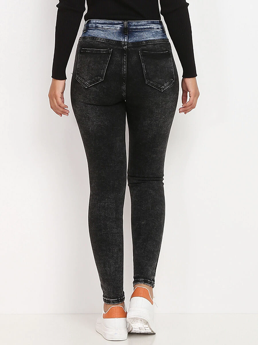 Modèle gris foncé délavé avec empiècements bleu délavé à la taille.