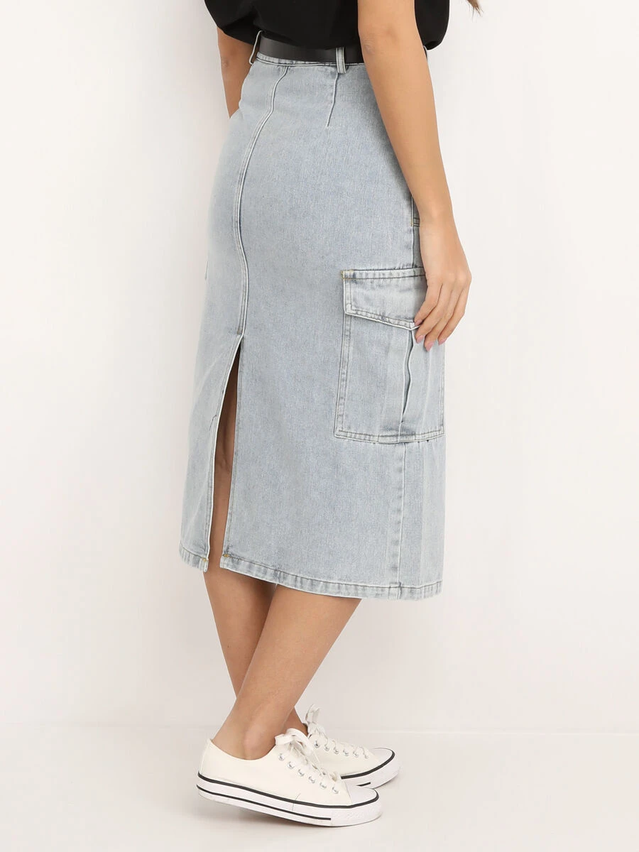 Jupe cargo en jeans avec ceinture en simili fendue à l’arrière.