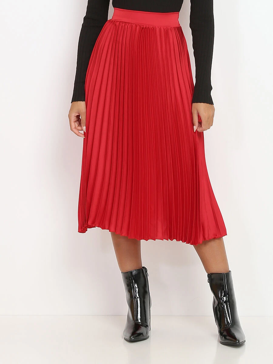 Jupe plissée mi-longue en tissu satiné.